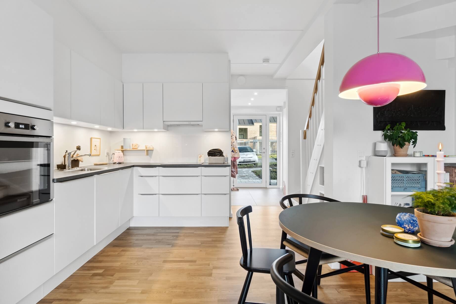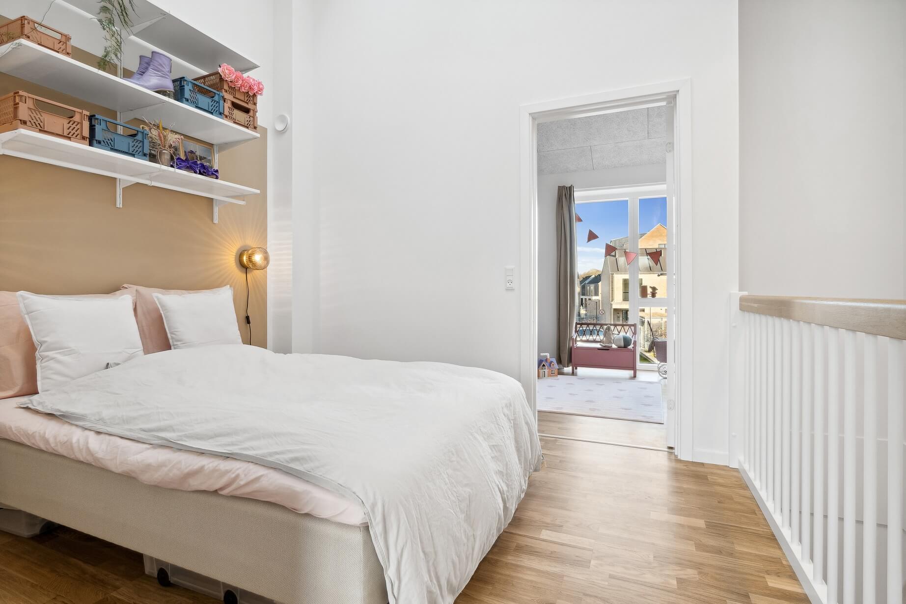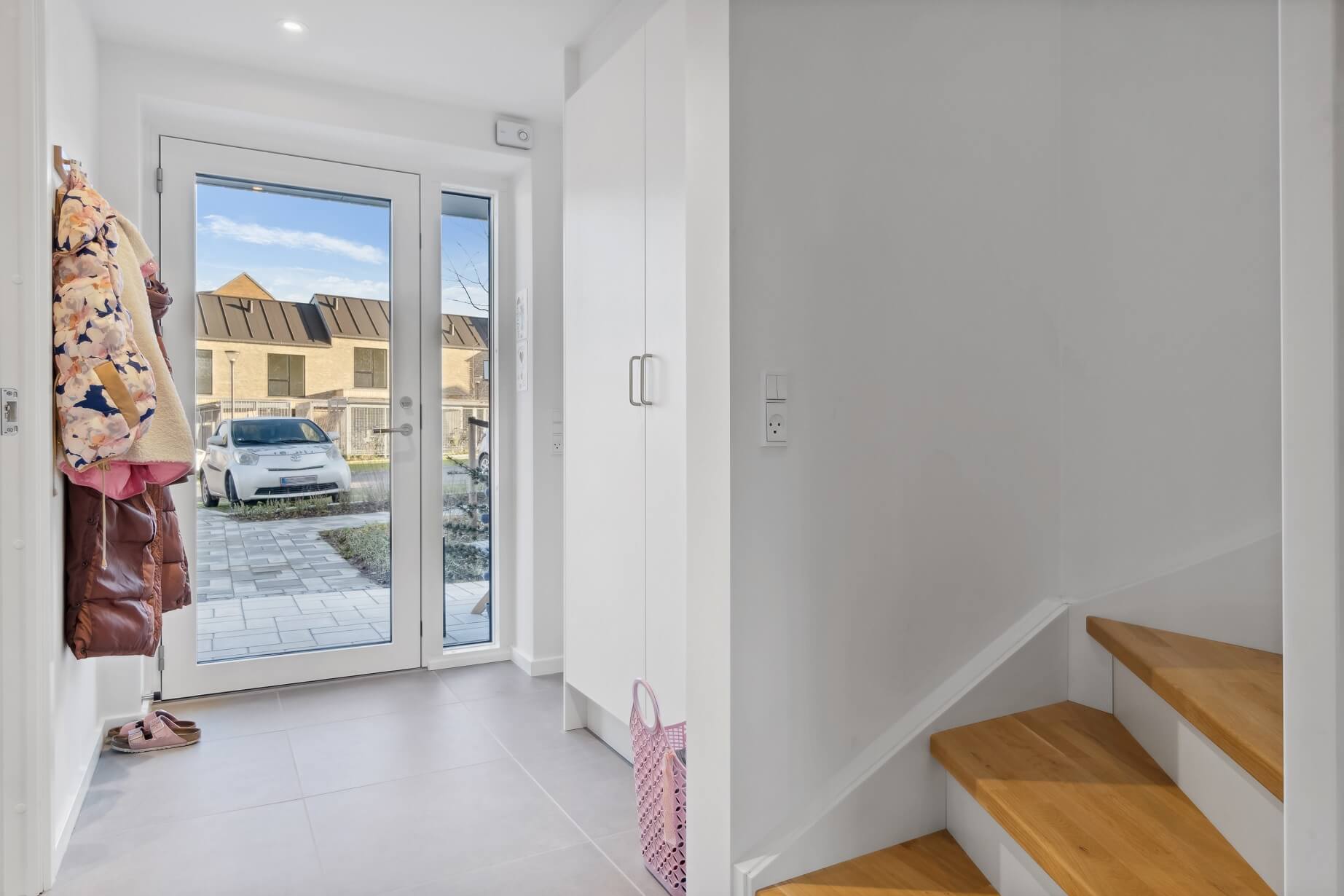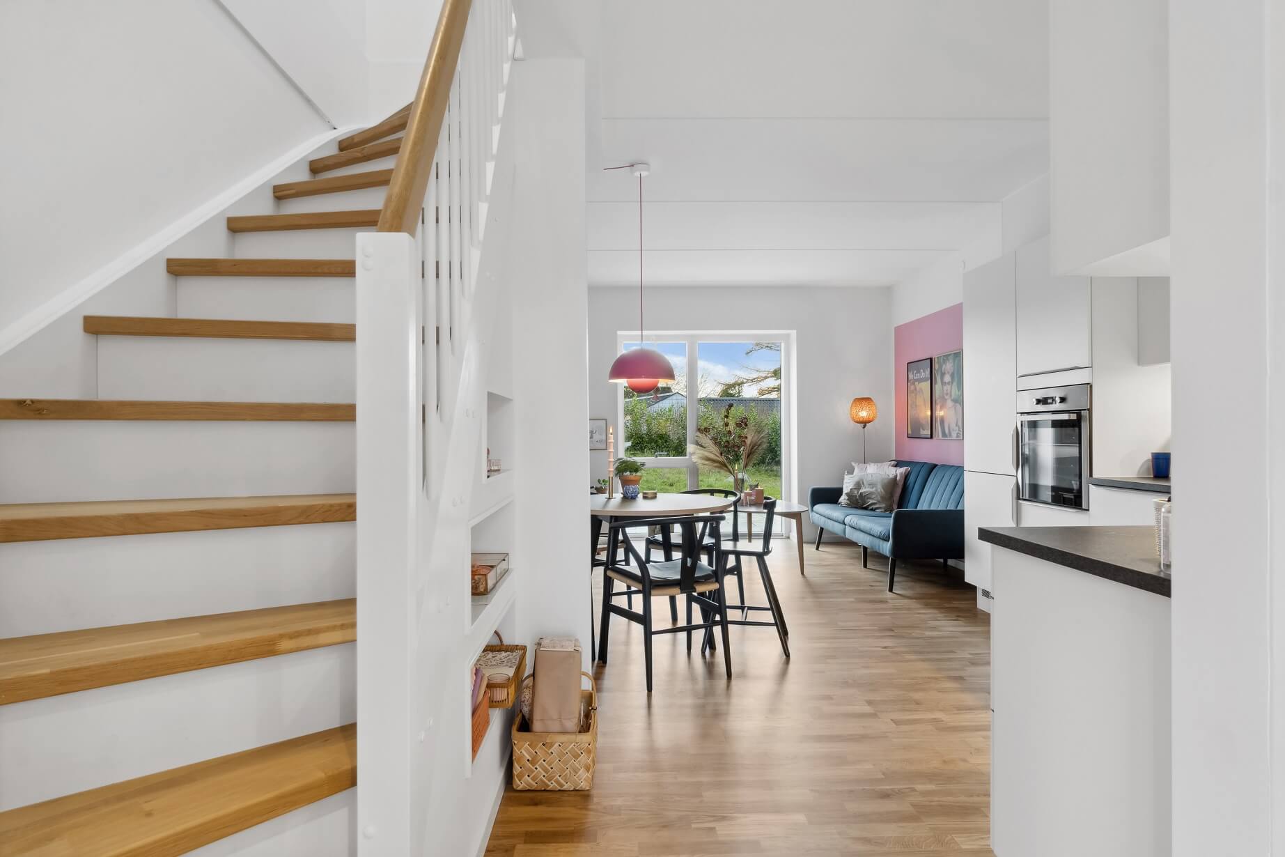 Når du træder ind i huset, vil du bemærke den rummelige entré med en garderobe til opbevaring. Fra entréen er der adgang til det åbne køkken-alrummet, hvor der er god plads til både at indrette spiseplads og stue. Fra alrummet er der udgang til terrassen, hvor du kan nyde den omkringliggende natur og friske luft. På førstesalen er der mulighed for at bruge den store repos som hjemmekontor, til skabsopbevaring eller noget helt tredje. Rækkehuset har også et stort soveværelse og et værelse med faste garderobeskabe. Badeværelset er indrettet med lyse materialer og har væghængt toilet, bruseniche og vaskesøjle.