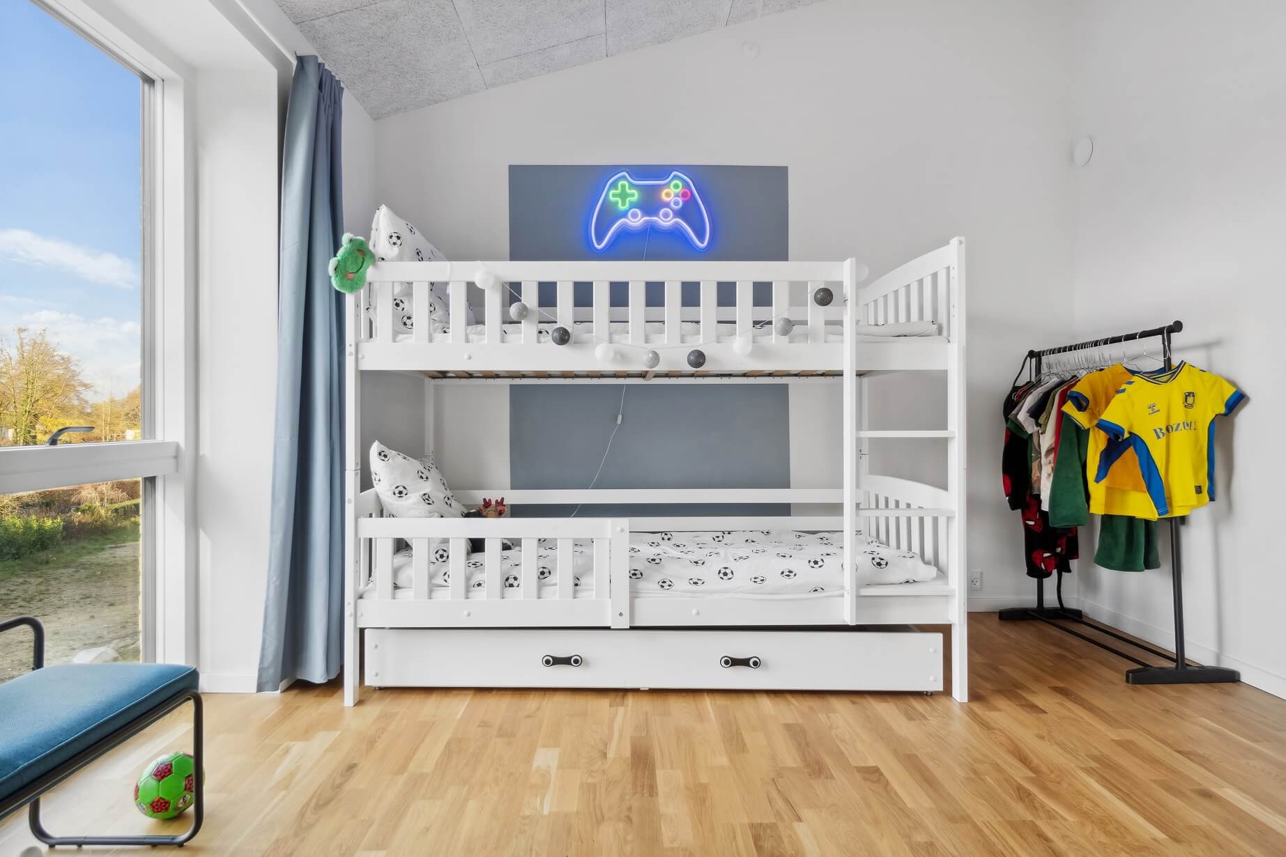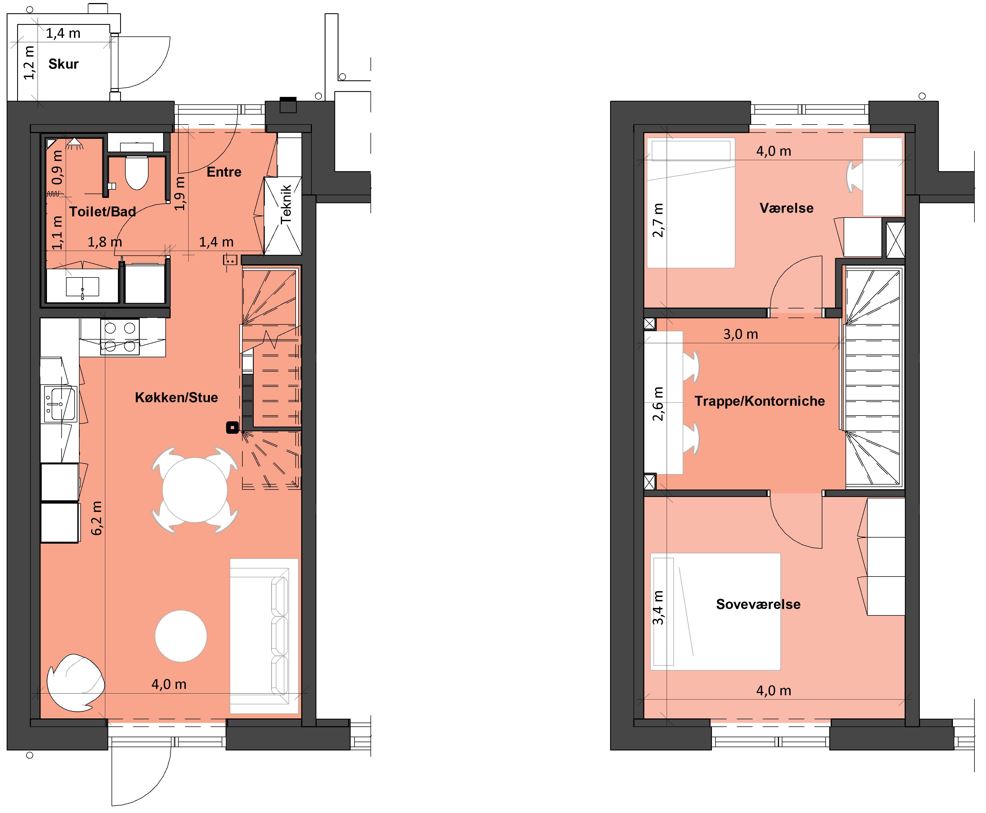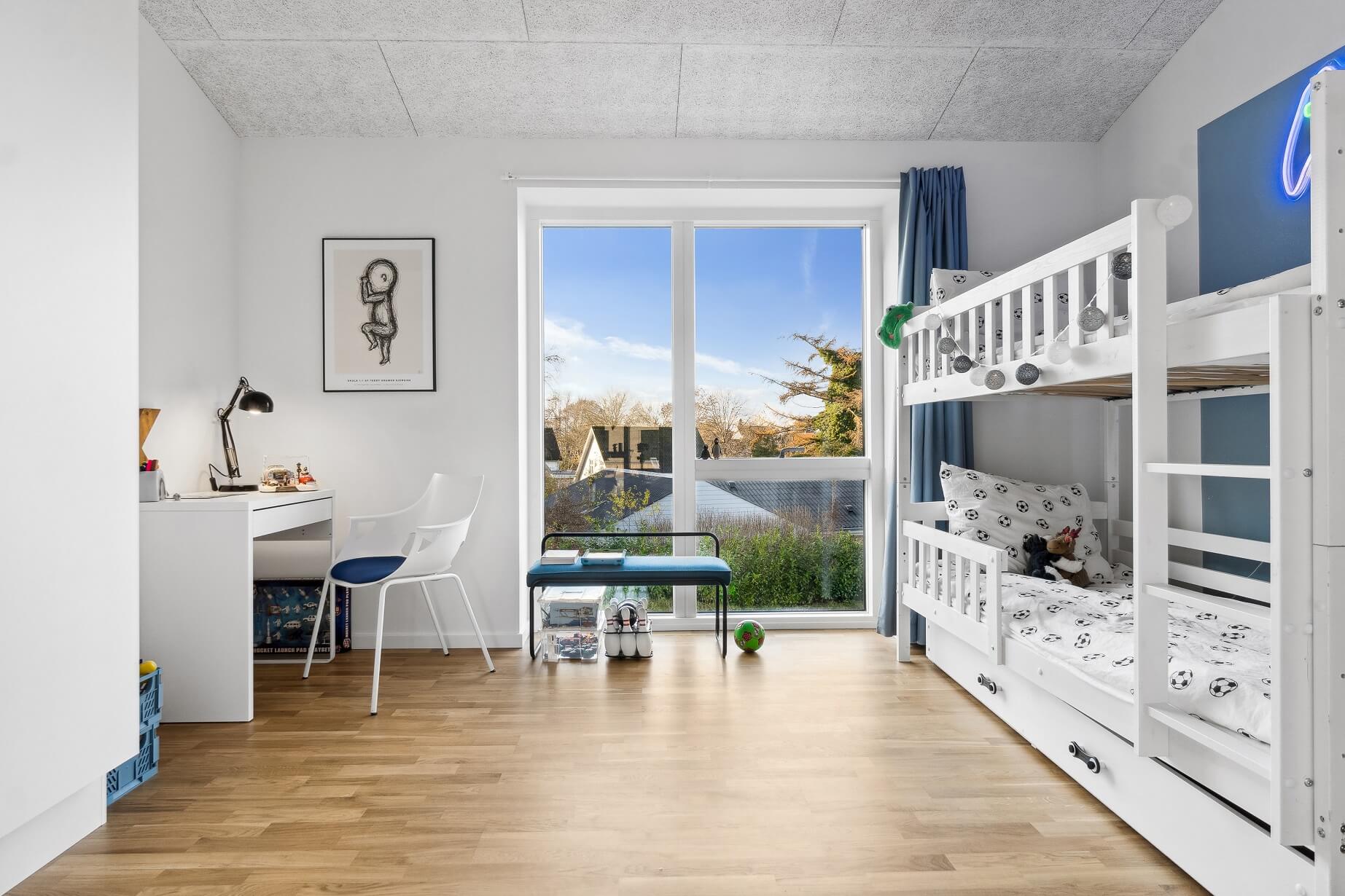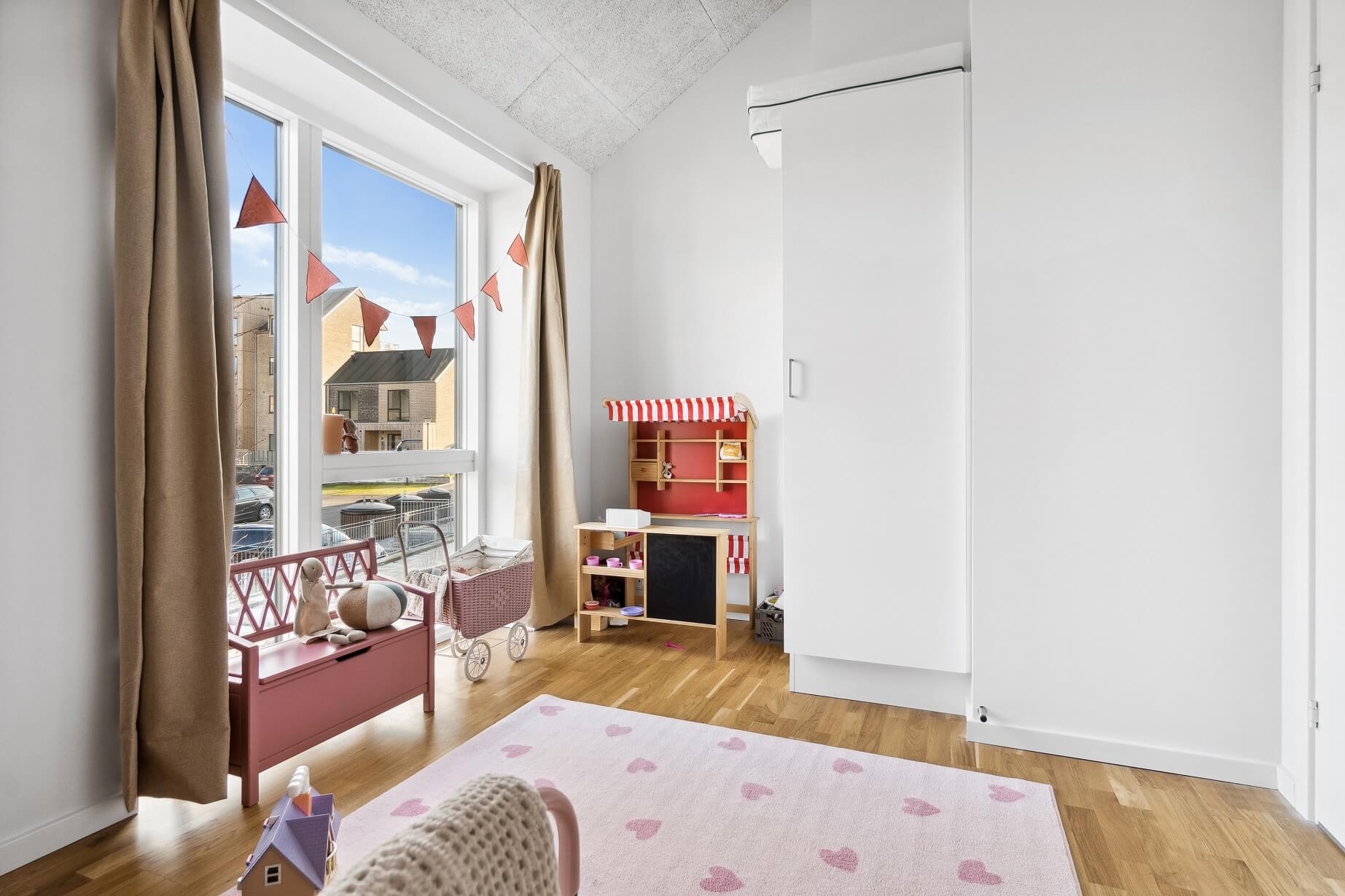 Når du træder ind i huset, vil du bemærke den rummelige entré med en garderobe til opbevaring. Fra entréen er der adgang til det åbne køkken-alrummet, hvor der er god plads til både at indrette spiseplads og stue. Fra alrummet er der udgang til terrassen, hvor du kan nyde den omkringliggende natur og friske luft. På førstesalen er der mulighed for at bruge den store repos som hjemmekontor, til skabsopbevaring eller noget helt tredje. Rækkehuset har også et stort soveværelse og et værelse med faste garderobeskabe. Badeværelset er indrettet med lyse materialer og har væghængt toilet, bruseniche og vaskesøjle.