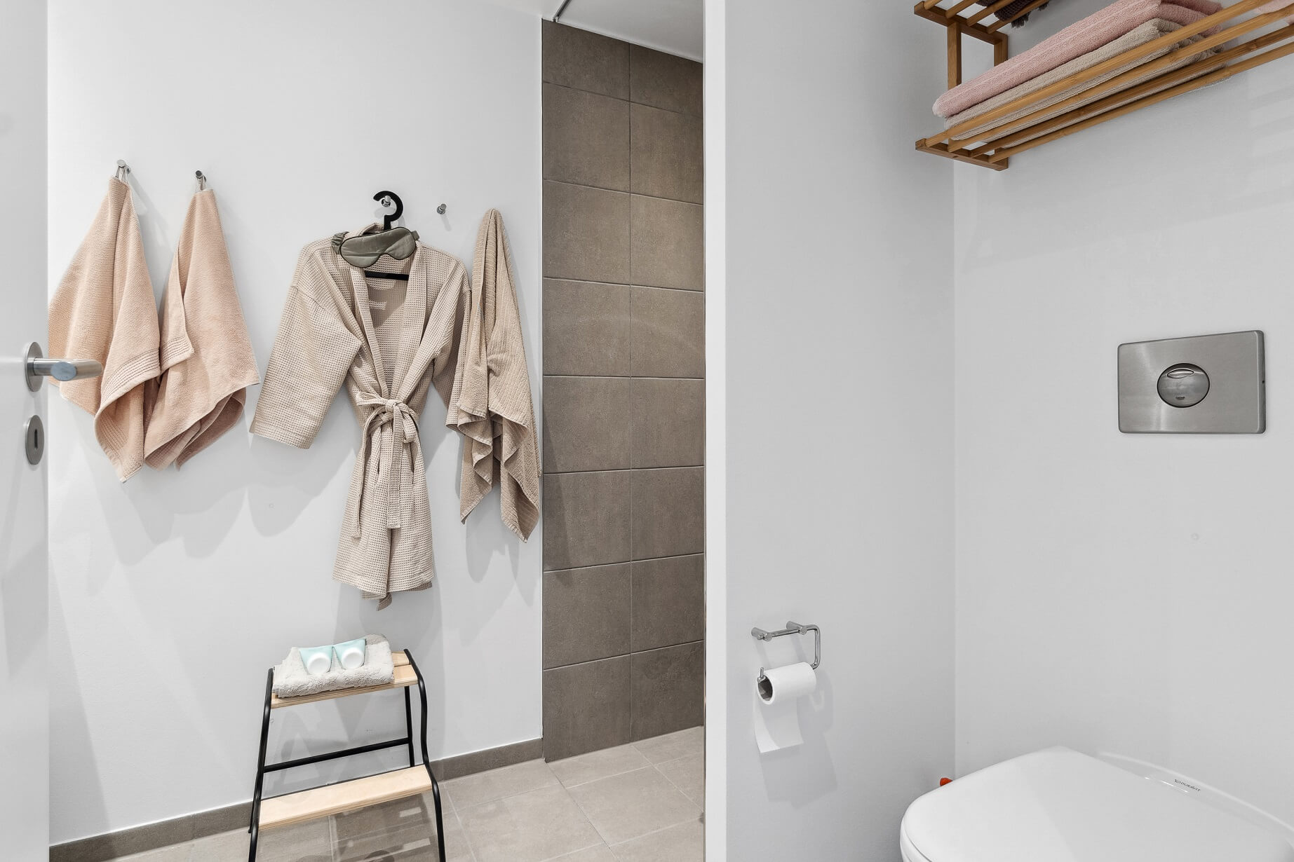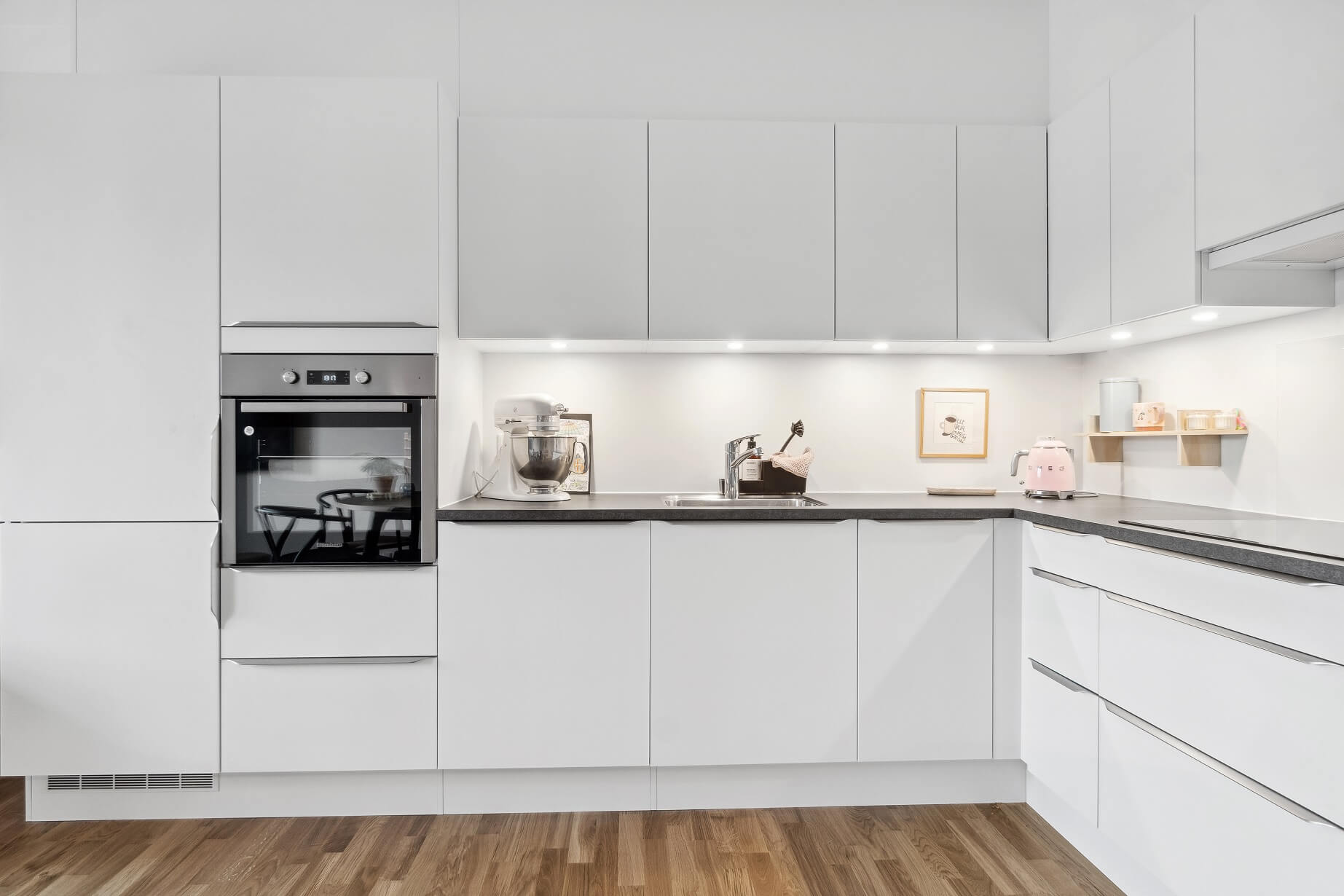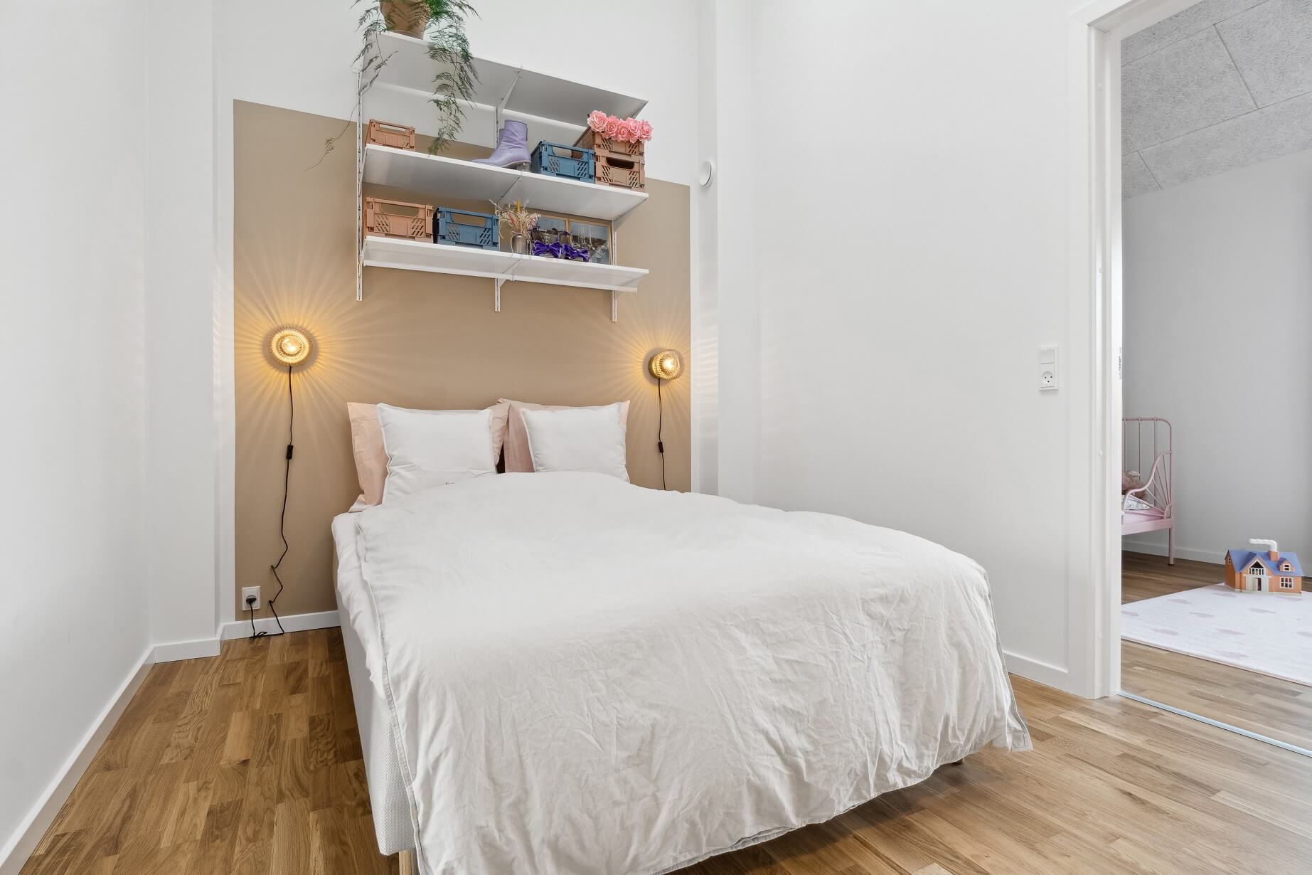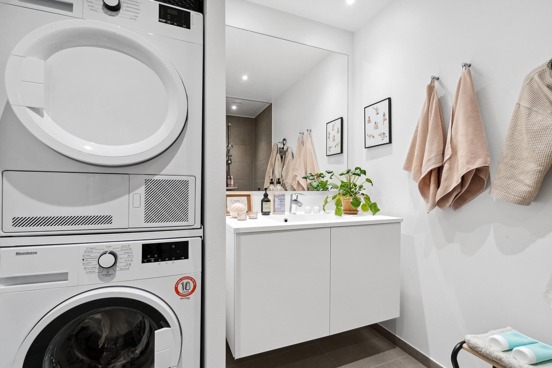 Når du træder ind i huset, vil du bemærke den rummelige entré med en garderobe til opbevaring. Fra entréen er der adgang til det åbne køkken-alrummet, hvor der er god plads til både at indrette spiseplads og stue. Fra alrummet er der udgang til terrassen, hvor du kan nyde den omkringliggende natur og friske luft. På førstesalen er der mulighed for at bruge den store repos som hjemmekontor, til skabsopbevaring eller noget helt tredje. Rækkehuset har også et stort soveværelse og et værelse med faste garderobeskabe. Badeværelset er indrettet med lyse materialer og har væghængt toilet, bruseniche og vaskesøjle.